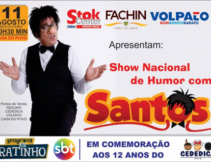 Para comemorar mais um ano, traremos o Humorista Santos, do Programa do Ratinho, com seu espetacular " Show do Santos", que acontecerá no dia 11 de agosto, às 20h30min, na Casa do Povo.